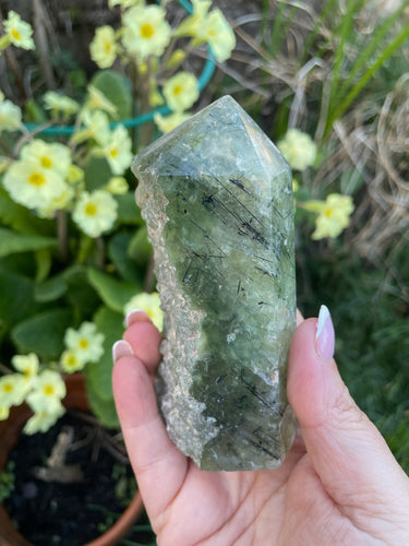 Large Prehnite and Tourmaline Rough Tower Specimen